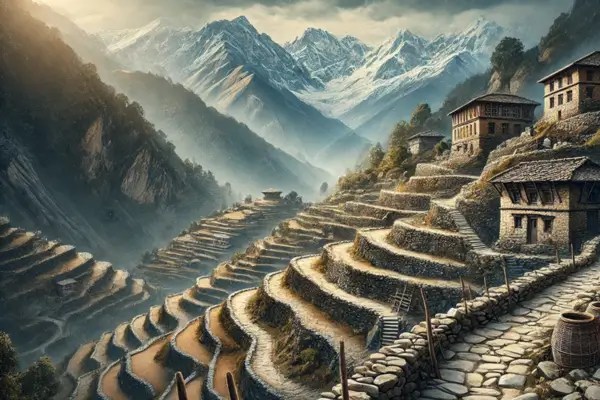 Os caminhos de pedra em regiões montanhosas do Nepal são estruturas centenárias que desempenham um papel vital no transporte e